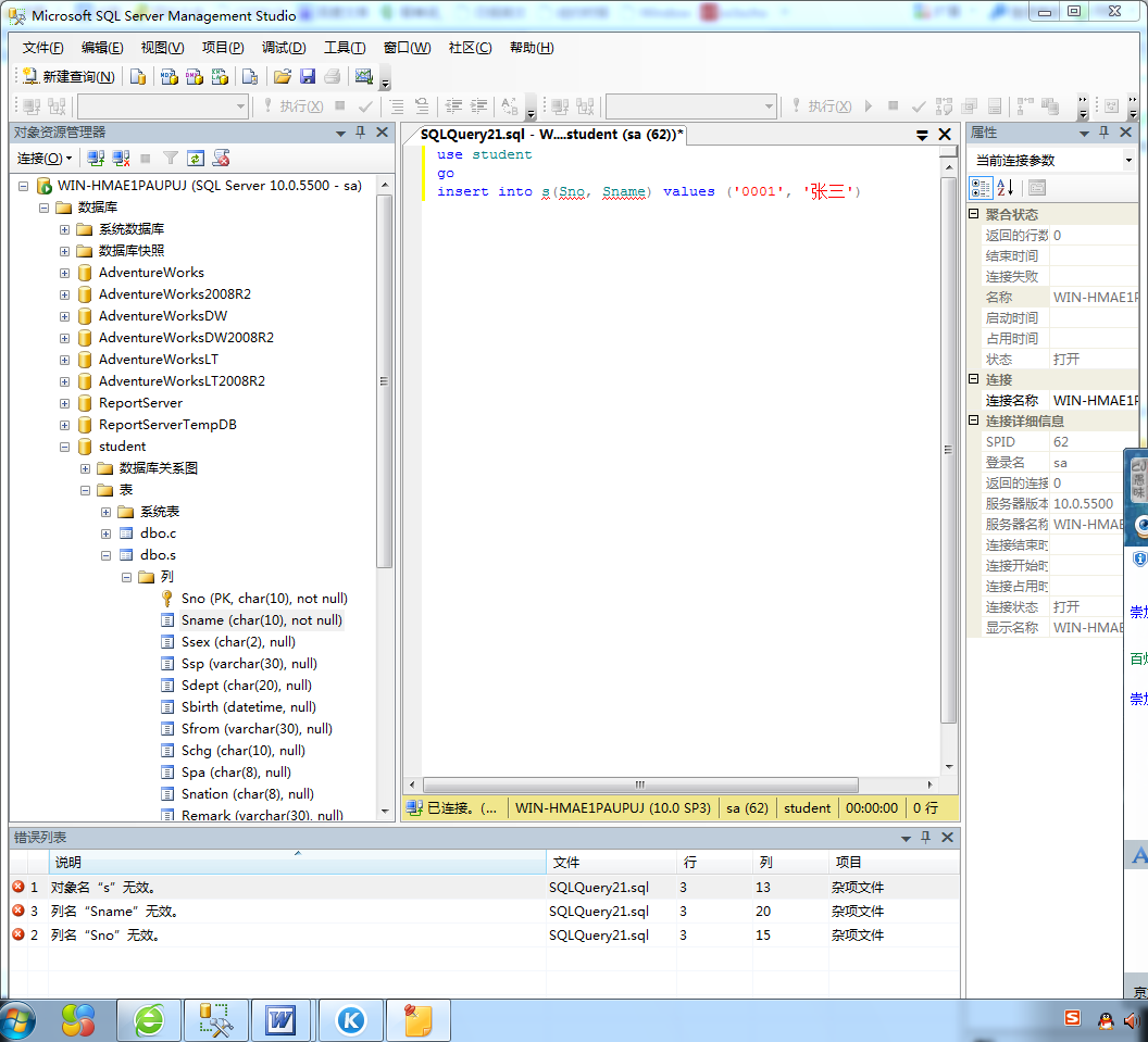 sql server 2008为何往表中插入数据是会出现表名,列名对象无效