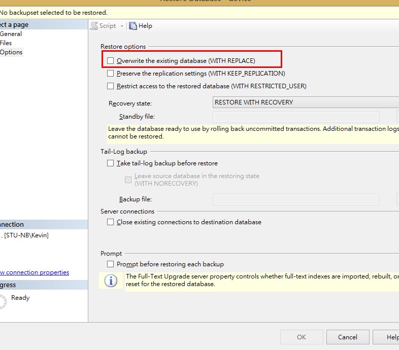 2)如果这部分数据你可以忽略,还原时候加上 with replace选项