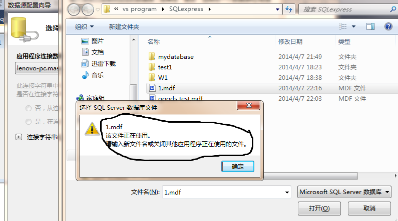 mdf是数据库文件,要想使用它,在数据库分离这个数据库,或者关闭数据库进程。