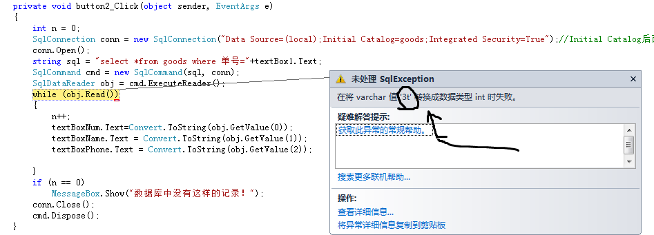 我是想通过按button2 按钮,通过textbox1 输入单号来查询goods数据库的单号。然后显示在其他三个文本框中。