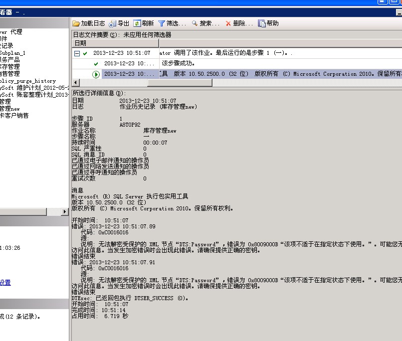 四、进行包配置之后,在vs2008debug能够通过,经过配置执行计划显示成功执行。但是点击进入详细步骤观看,发现如下错误:说明: 无法解密受保护的 XML 节点“DTS:Password”,错误为 0x8009000B“该项不适于在指定状态下使用。”。可能您无权访问此信息。当发生加密错误时会出现此错误。请确保提供正确的密钥。