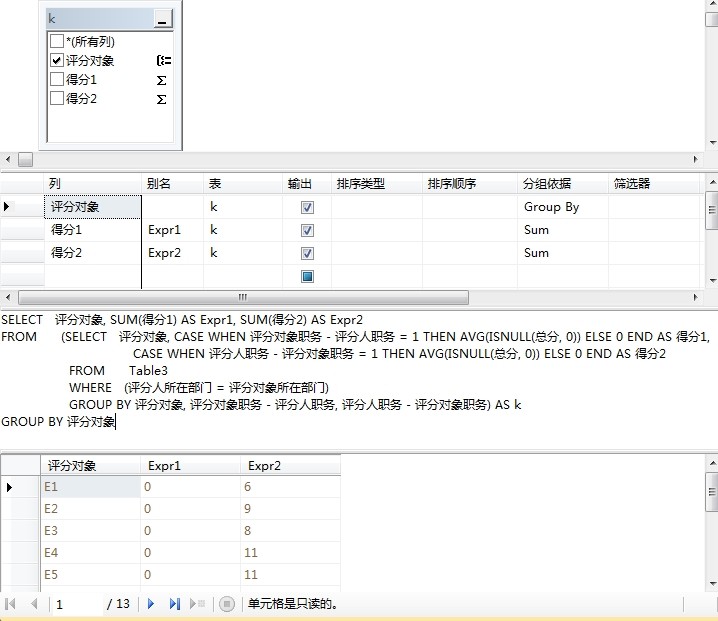 FROM (SELECT 评分对象, CASE WHEN 评分对象职务 - 评分人职务 = 1 THEN AVG(ISNULL(总分, 0)) ELSE 0 END AS 得分1,
