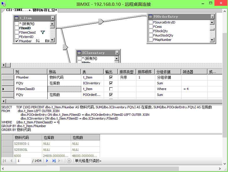 在库数是用dbo.ICInventory.FItemID分组后 SUM(dbo.ICInventory.FQty) 数量,筛选条件为dbo.t_Item.FItemClassID = 4