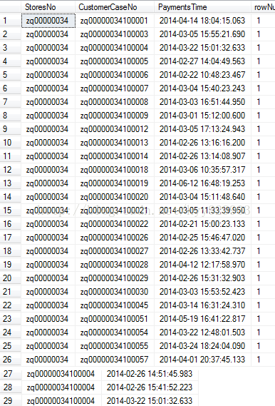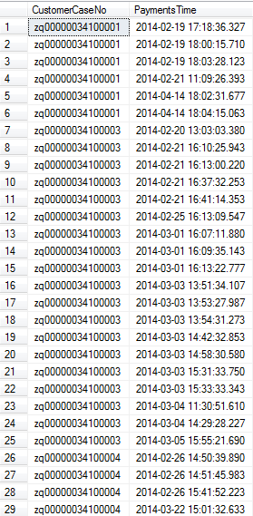 现在需要做的事,把这个数据按照[CustomerCaseNo]分组以后  取出PaymentsTime字段里面的最近时间,要做到这个,用下面的语句就可以实现