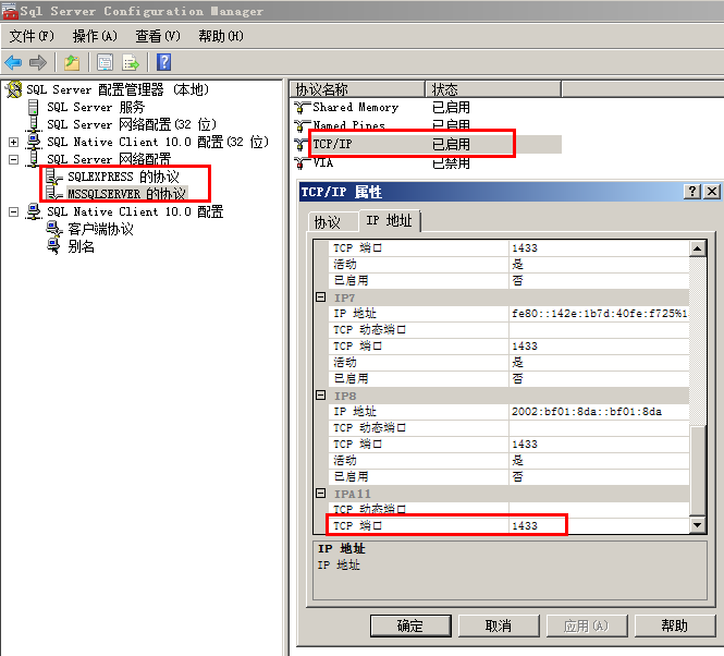 设置配置管理器中TCP/IP,端口设置为默认的1433。