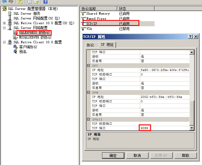 更改SQL Server (SQLEXPRESS)TCP/IP