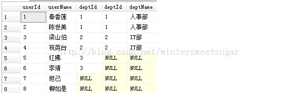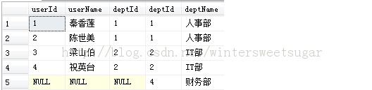 SELECT * FROM dbo.UserTB LEFT JOIN dbo.DeptTB ON dbo.UserTB.deptId=dbo.DeptTB.deptId结果: