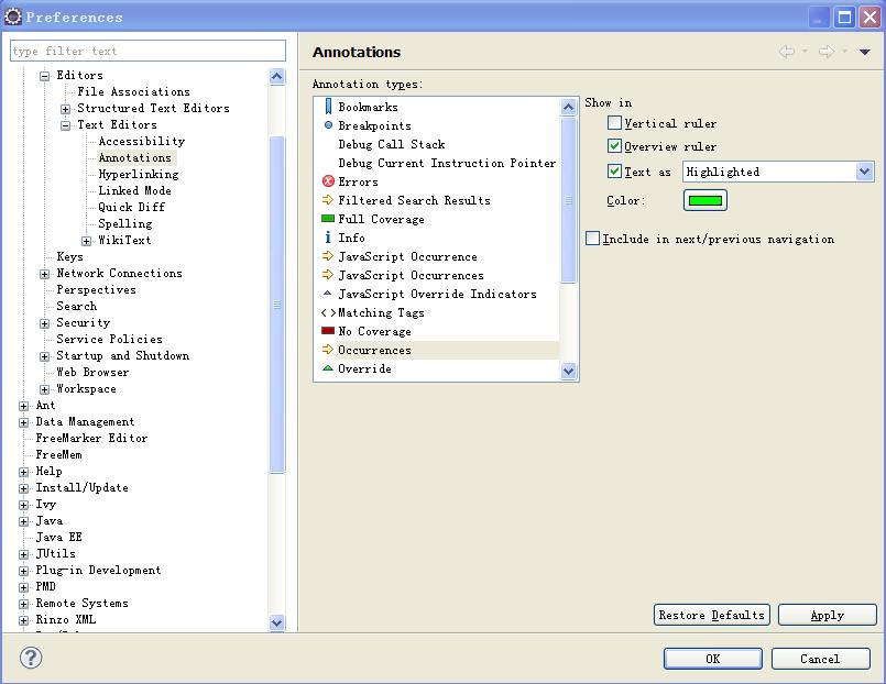 Window->Preferences->General->Editors->Annotations->Occurrences