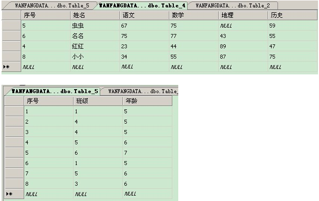 select a.序号,b.姓名,a.班级,a.年龄,b.语文,b.数学,b.地理,b.历史