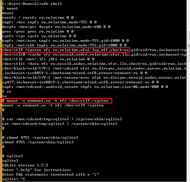 cp /mnt/sdcard/tmp/sqlite3 /system/xbin/sqlite3? (注意:这一步可能报两种错,第一种: cp not found,将命令换成cat /mnt/sdcard/tmp/sqlite3 > /system/xbin/sqlite3, 第二种:read-only file system,说明/system是只读的,此时需要重新mount,改为可读写,然后继续拷贝)