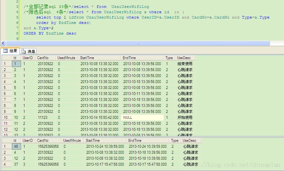 /*查询 用户卡号使用的最后时间*/select * from UzaiUserWifiLog a where id in (select top 1 idfrom UzaiUserWifiLog where UserID=a.UserIDand CardNo=a.CardNoand Type=a.Typeorder by EndTime desc) and a.Type=2ORDER BY EndTime desc