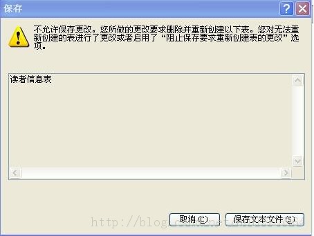 自己检查了一下,是表中字段的数据类型与自己添加的数据类型不匹配。通过修改添加的数据类型当然能解决,所以想试着修改表的数据类型看看是否同样能解决。但是重新设计表后保存的时候又出现了下面提示: