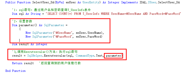 问题出在SelectUser_DA(ByVal enUser As UserEntity)在调用 Executescalar(ByVal cmdText As String, ByVal cmdType As CommandType, ByVal paramete As SqlParameter())时,第三个参数没有传入,虽然在代码上看似传入了参数,但是在Executescalar()函数中并没有读入,问题在于我第一次写的添加参数的代码:cmd.Parameters.Add(paramete),之后改为 cmd.Parameters.AddRange(paramete),就正确了。
