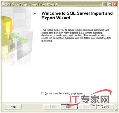 第一步是点击开始并选择运行并输入CMD然后在命令提示符里输入DTSWIZARD。SQL Server 导入和导出向导的欢迎界面将显示出来,如下图所示:
