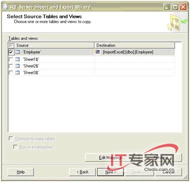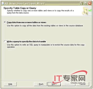 在Specify Table Copy or Query(指定表复制或查询)向导界面中,选择copy data from one or more tables or views(从一个或多个表或视图复制数据)选项,并继续这个向导到下一个界面。