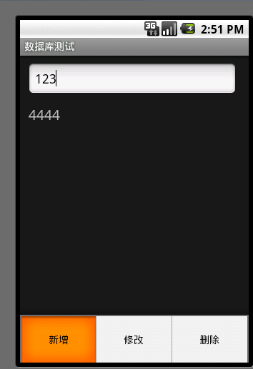 import android.app.Activity;import android.database.Cursor;import android.database.sqlite.SQLiteCursor;import android.os.Bundle; import android.view.Menu;  import android.view.MenuItem;import android.view.View;import android.widget.AdapterView;import android.widget.EditText;import android.widget.ListAdapter;import android.widget.ListView;import android.widget.SimpleCursorAdapter;import android.widget.AdapterView.OnItemClickListener;import android.widget.AdapterView.OnItemSelectedListener;public class testDbActivity extends Activity {		private dbHelper db;	private Cursor myCursor;	private ListView myListView;	private EditText myEditText;	private int _id;	protected final static int MENU_ADD=Menu.FIRST;	protected final static int MENU_EDIT=Menu.FIRST+1;	protected final static int MENU_DELETE=Menu.FIRST+2;		   @Override	public boolean onCreateOptionsMenu(Menu menu) {		// TODO Auto-generated method stub		   super.onCreateOptionsMenu(menu);		menu.add(Menu.NONE, MENU_ADD, 0, R.string.ADD);		menu.add(Menu.NONE, MENU_EDIT, 0,R.string.EDIT);		menu.add(Menu.NONE, MENU_DELETE, 0,R.string.DELETE);		 return true;	}		   @Override	public boolean onOptionsItemSelected(MenuItem item) {		// TODO Auto-generated method stub				super.onOptionsItemSelected(item); 		switch (item.getItemId()) {		case MENU_ADD:			operation("add");			break;		case MENU_EDIT:			operation("edit");			break;		case MENU_DELETE:			operation("delete");			break;		default:			break;		}		return true;	}	   	   	       /** Called when the activity is first created. */    @Override    public void onCreate(Bundle savedInstanceState) {        super.onCreate(savedInstanceState);        setContentView(R.layout.main);        myEditText=(EditText)findViewById(R.id.EditText1);        myListView=(ListView)findViewById(R.id.ListView1);        db=new dbHelper(testDbActivity.this);        myCursor=db.select();        SimpleCursorAdapter adpater=new SimpleCursorAdapter(this        		, R.layout.test, myCursor,        		new String[]{dbHelper.FIELD_TITLE},        		new int[]{R.id.topTextView});        myListView.setAdapter(adpater);                myListView.setOnItemClickListener(new OnItemClickListener() {			@Override			public void onItemClick(AdapterView<?> arg0, View arg1, int arg2,					long arg3) {				// TODO Auto-generated method stub				myCursor.moveToPosition(arg2);				_id=myCursor.getInt(0);				myEditText.setText(myCursor.getString(1));			}		});                        myListView.setOnItemSelectedListener(new OnItemSelectedListener() {			@Override			public void onItemSelected(AdapterView<?> arg0, View arg1,					int arg2, long arg3) {				// TODO Auto-generated method stub				SQLiteCursor sc=(SQLiteCursor)arg0.getSelectedItem();				_id=sc.getInt(0);				myEditText.setText(sc.getString(1));			}			@Override			public void onNothingSelected(AdapterView<?> arg0) {				// TODO Auto-generated method stub							}		});    }    private void operation(String cmd)    {    	if(myEditText.getText().toString().equals(""))    	return;    	if(cmd=="add")    		db.insert( myEditText.getText().toString());    	if(cmd=="edit")    		db.update(_id,  myEditText.getText().toString());    	if(cmd=="delete")    		db.delete(_id);    	myCursor.requery();    	myListView.invalidateViews();    	myEditText.setText("");    	_id=0;    	    }                                   }