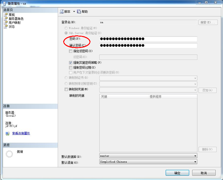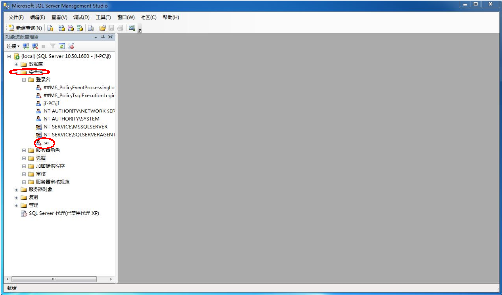重新回到Local下的子菜单安全性,单击登录名,选择它的子菜单sa,右击sa属性